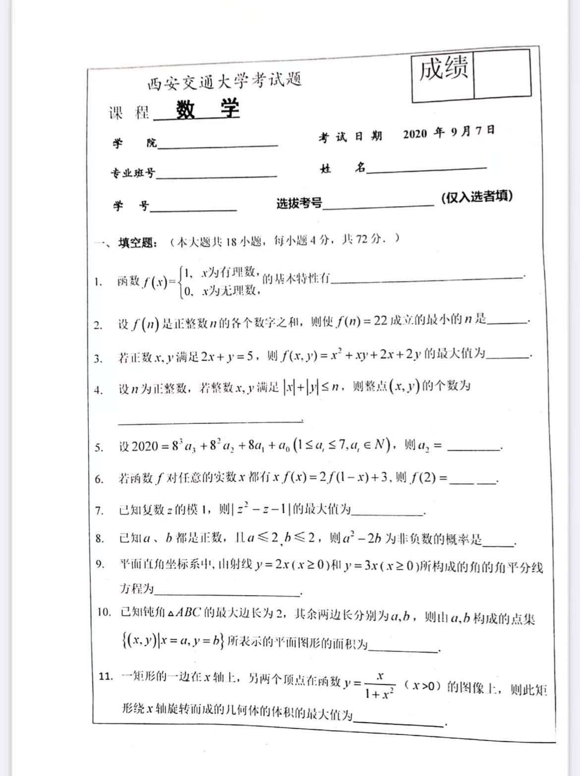 2020西交数学入学考试