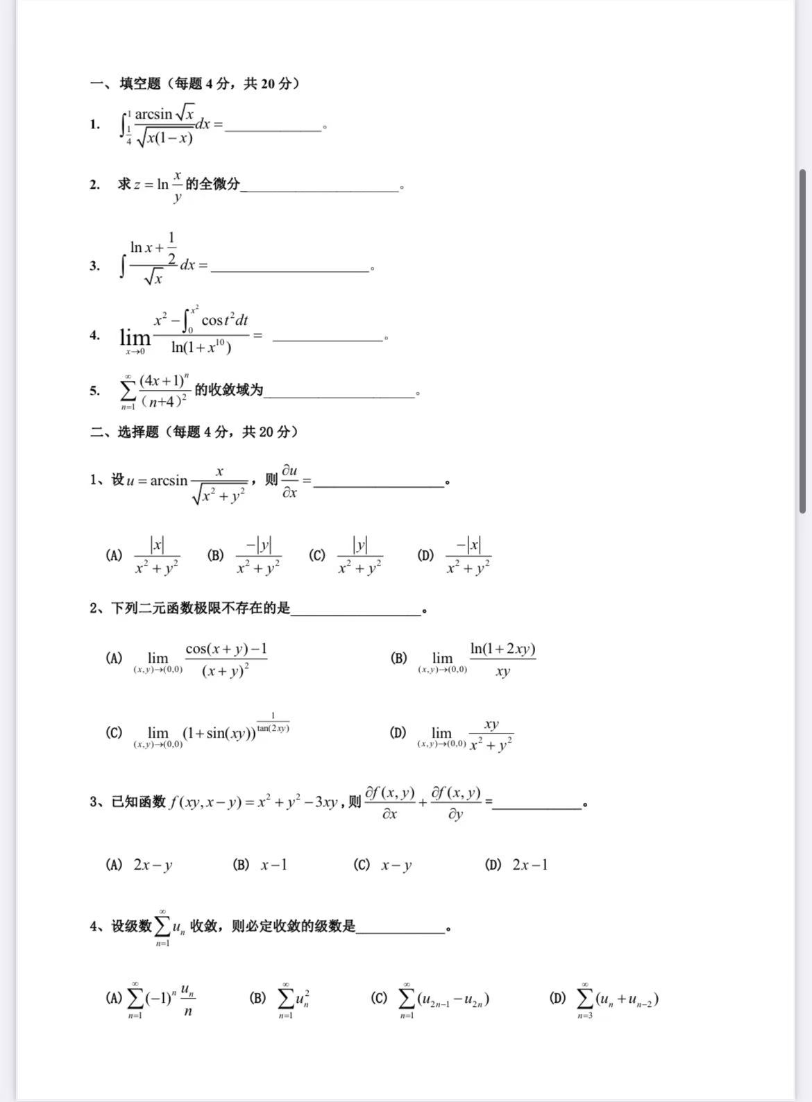 这是2022文科高数期末试卷